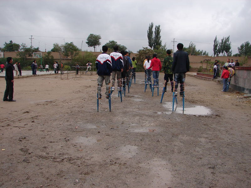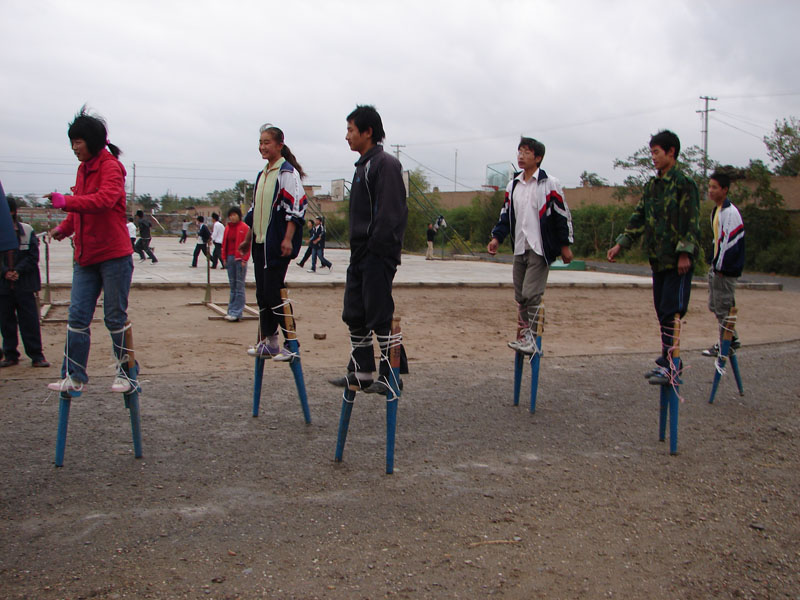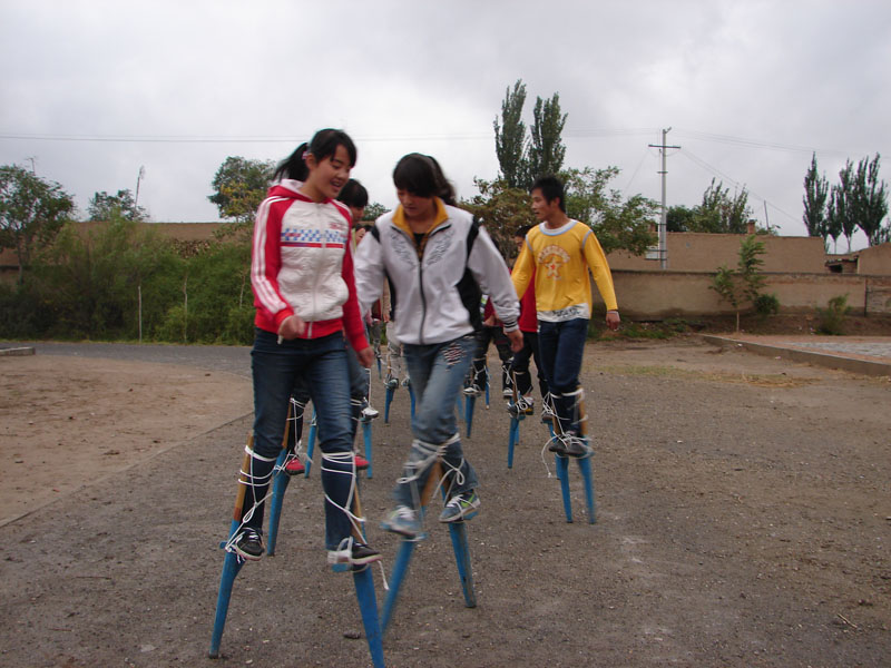 不到两个小时,他们踩着高跷都能各自独立行走了。胆大的同学满面笑容,胆小的同学走起来还颤颤微微…….