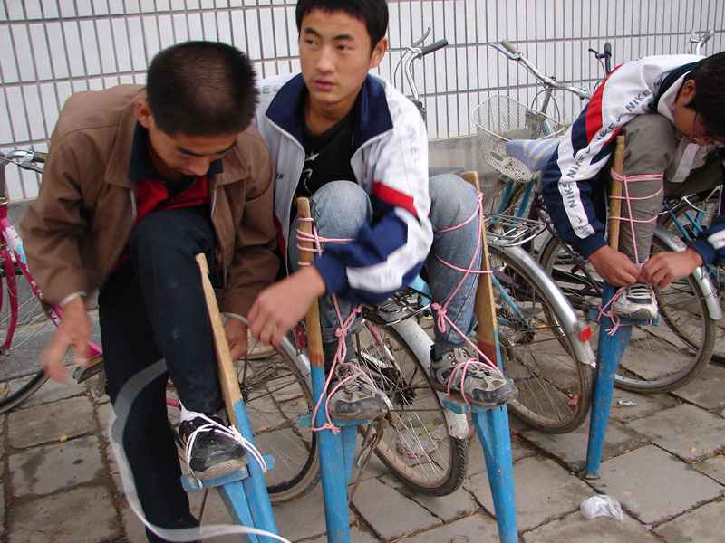 踩高跷前的准备工作是非常重要的。跷子是用木头做成的,大约有80公分高,脚踩在支杆处,高踩上端部分用绳子绑在腿上,绳子绑的太松了,走起来就会摔交,绑的太紧,勒的腿疼。看!同学们在认真的绑着自己的跷子。