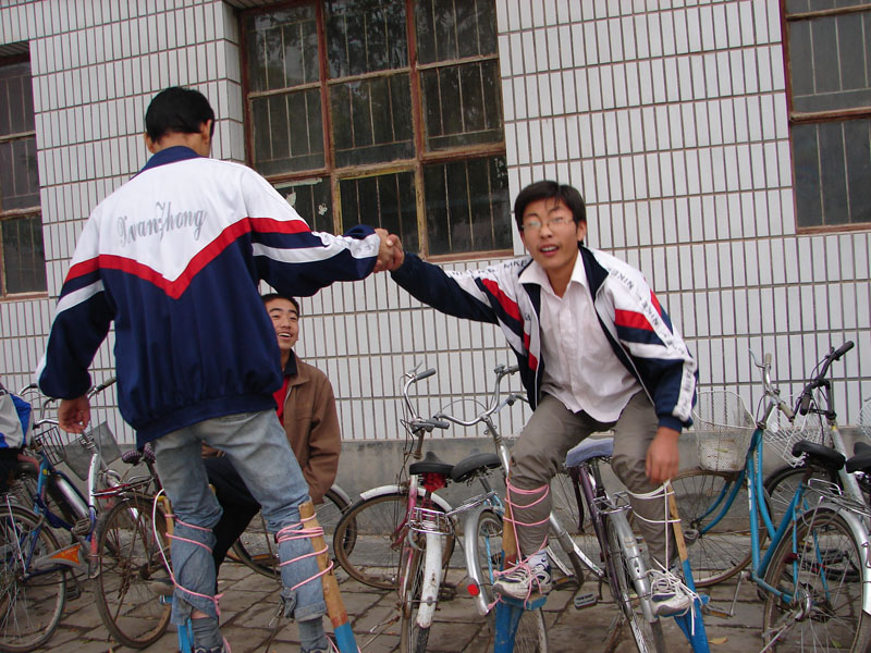 同学们真聪明,坐在自行车上绑跷子,站起来的时候会方便一些。瞧!我们班的文面书生王华同学已绑好自己的跷子,高军同学帮扶他站起呢!
