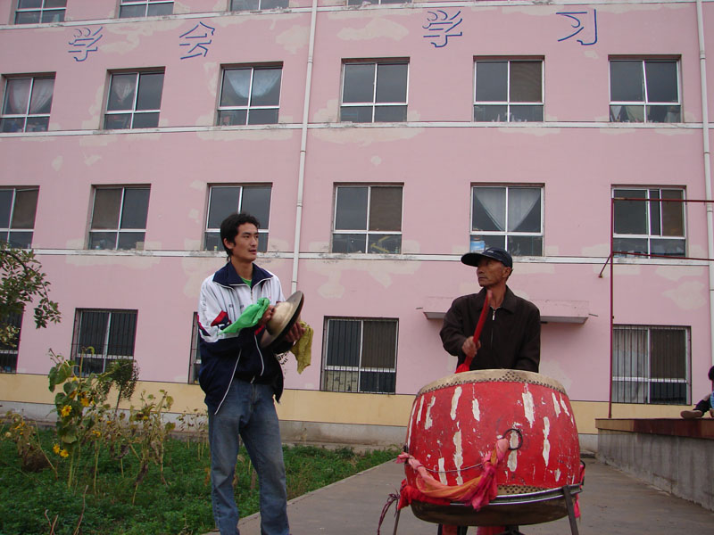 踩高跷是一项热闹的活动,我们体育老师在打锣鼓,班长正在起劲地打着嚓嚓。
