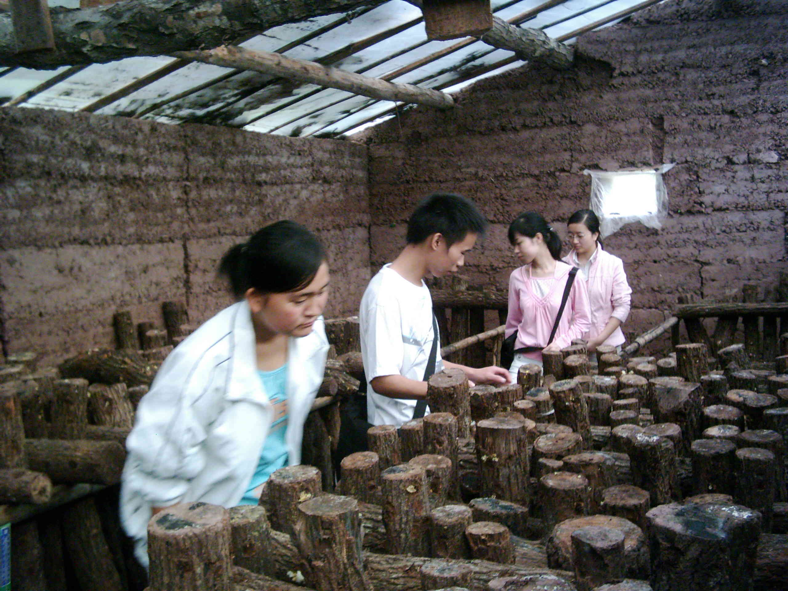 冲洗完银耳,我便和管理员一同来到了当地一家银耳种植户的银耳棚内。此时,眼前的一切让我不觉一惊,刚才我亲手接触的那白白胖胖的银耳就是生长在这似乎已经干枯了的树木上的吗?是的,这就是它们生长的地方,我这才惋惜刚才没有认真观察银耳的模型棚。