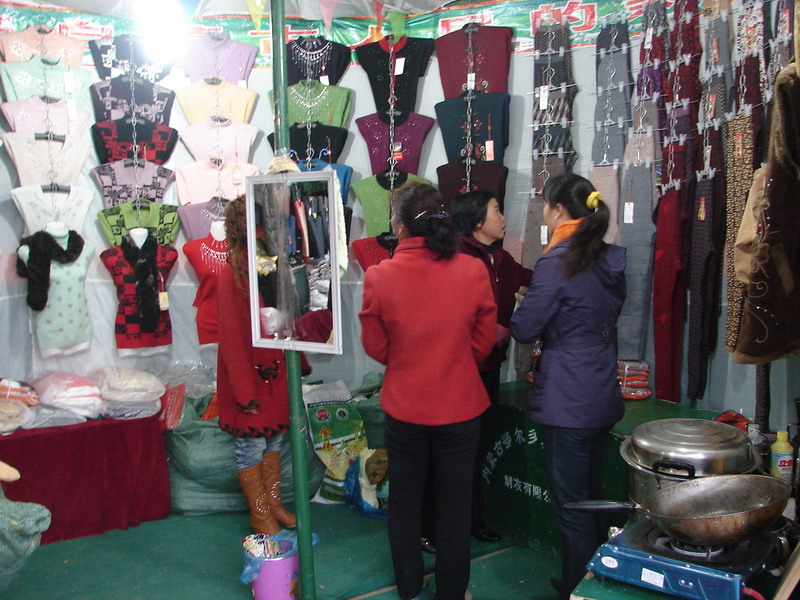 紧挨着这个毛被区的,在旁边是一个老年女式羊毛衫销售区。在这里,我只看到了有中老年妇女来看衣服。不过,这里的东西还真是琳琅满目,各式各样的都有,只是人太少了。