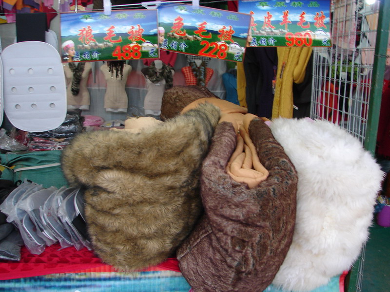 再走近些,看到了标着"狼毛被","兔毛被"等,我想这是不是拿真的狼毛和兔毛吧!?嗨,标价都是好几百呢。看到这些东西,上去摸了一把,还真是柔软啊,到底是"毛制品"。