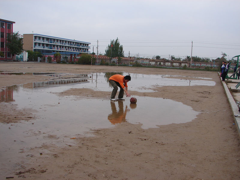 唉!糟了,篮球掉到水坑里了,李立明同学奋不顾身的跑去捡球了。看,他正想办法拿起来呢!尽管活动场所的条件差,但同学们玩的也很高兴。