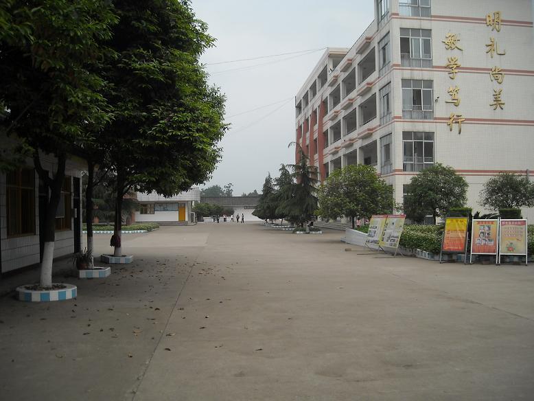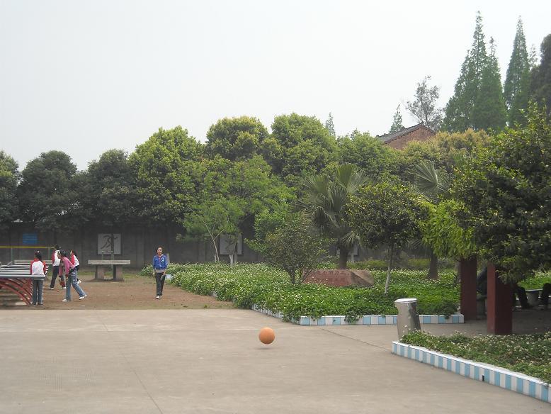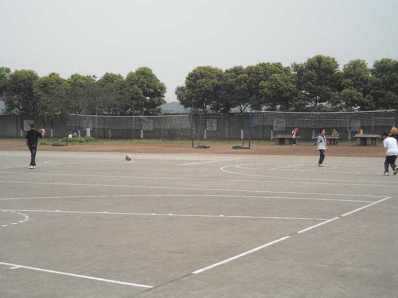 教学楼的最右边是个宽阔的操场,在这宽阔的操场洋溢着全校师生的笑声。操场上有两组篮球框,原本有三组,但是由于升旗仪式,所以把面对主席台的那组篮框给拆了。操场里还有跑道、足球场、乒乓台。