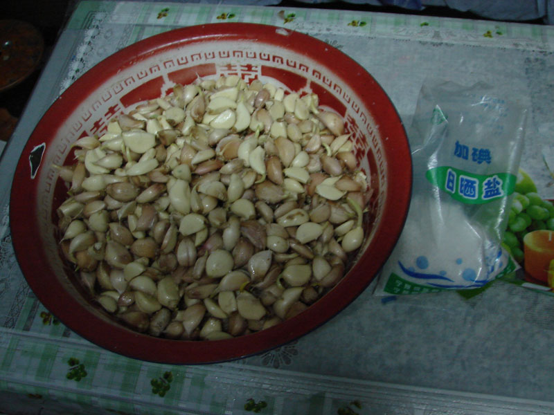 盐淹:将剥去皮的大蒜先用食盐淹。食盐的用量不能太多,像这样一盆大蒜用2把盐就够了,然后拌均匀,淹二天。