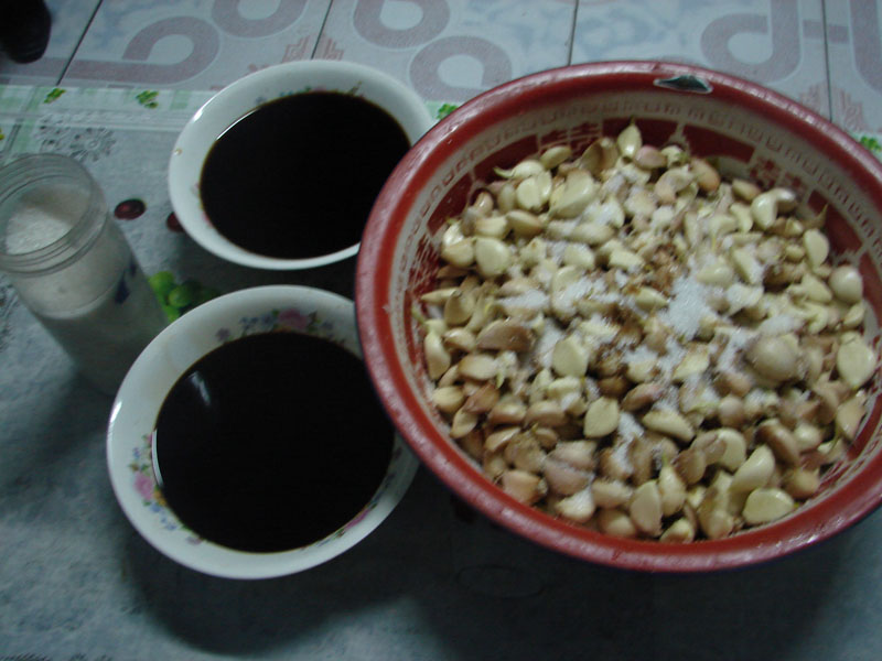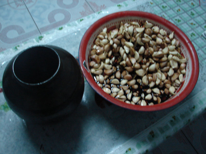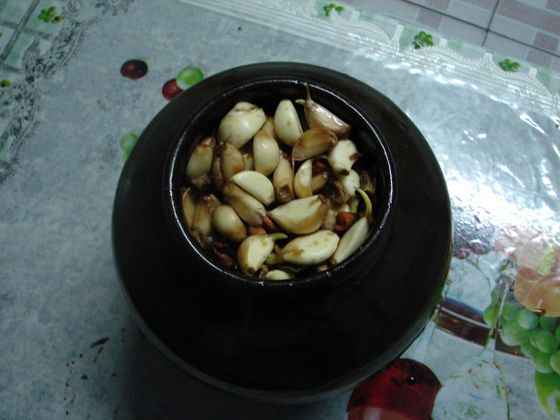 这就是用糖、醋、酱淹好的蒜,然后要装入瓷罐中,最好不用塑料容器装。