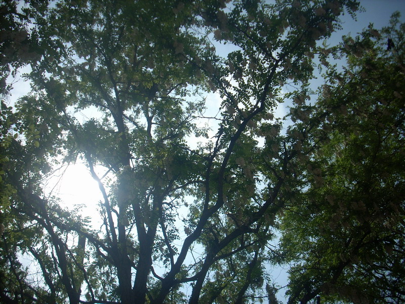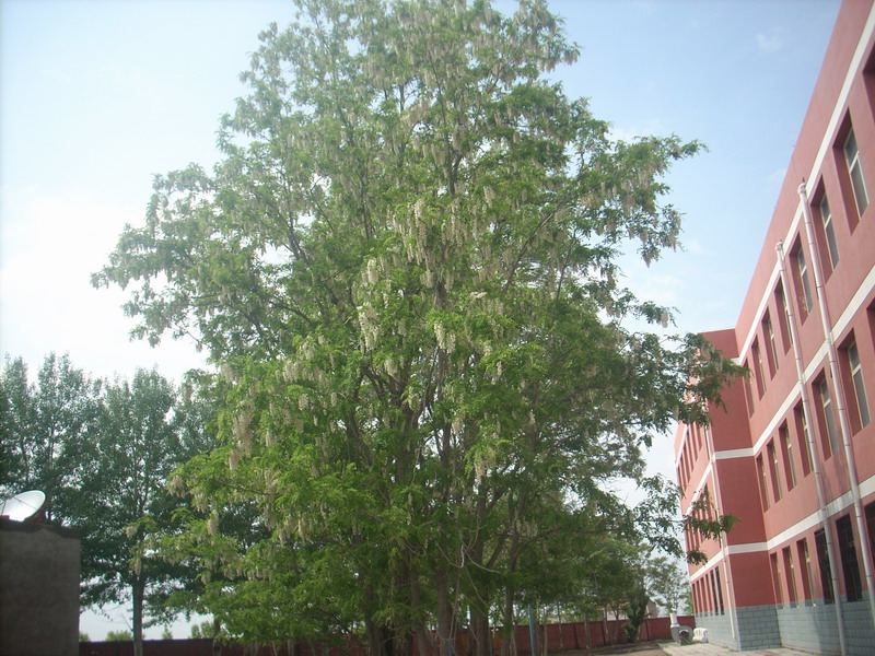 Look!The sky is so high ahd blue,and the air is so nice and clean.There are two large old scholartrees in our school .In May,the scholartrees are in full bloom.Their flowers are white,and their smell is so sweet that the air is nice all around the school.It\'s around us as we read book every morning.We feel very happy and spirit.