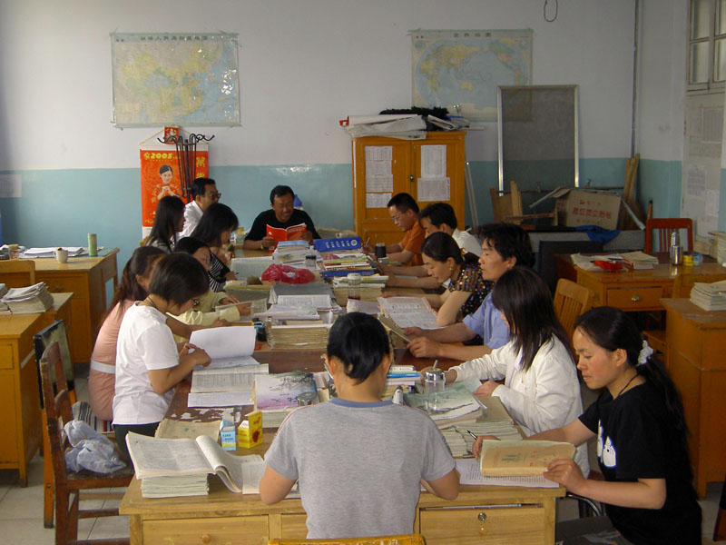 这是全体语文教师用教研活动时间在一起搞教学研讨。他们的办公室有点陈旧,办公桌看似也有点零乱,但他们在一起搞教学研究的气氛却很浓烈。