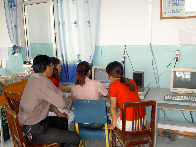 有了电脑,大家都很高兴,这是初中数学组的老师在一起进行网上教研,操作技术好的老师在操作,其他老师在那里耐心学习、讨论。