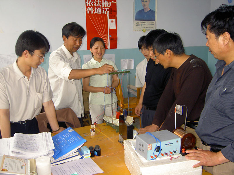 这是物理教研组的鲍老师在给全组老师演示他的"发明创造"。我们是农村中学,实验器材不全,按常规操作,有些实验老师没办法给我们演示,但鲍老师他就在器材不够的情况下完成了这个实验,不但在教室里给我们全班同学演示操作了,现在,他利用教研活动时间把这个经验向其他教师交流。