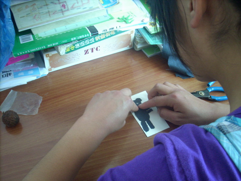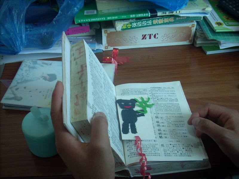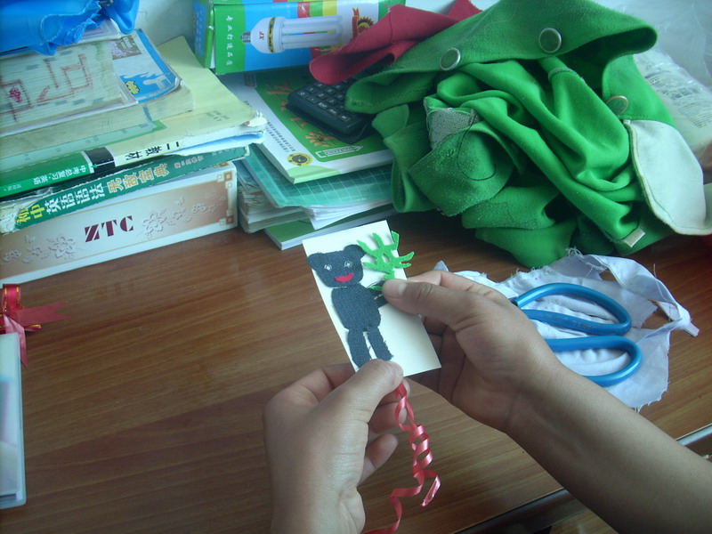 图片的部件都剪下来了,下一步就是把他们一件件粘到硬纸板上去,将他们组成一幅生动可爱的图片。这粘贴工序还真不是件容易事。尤其是粘贴眼睛,因为眼睛很小所以双面胶要少撕点,可是撕少了就没有胶了,撕多了,又大过眼睛了,所以要把握好尺度。功夫不负有心人,可爱的熊猫书签终于在我手中诞生了。我左看右看上看下看总觉得美中不足,似乎有些单调。我便用彩色笔在周围的空白处点缀了一番,小草、小花等。啊,好一个色彩斑斓的世界!最后,我又把之前剪好的矩形塑料袋粘到硬纸板上,又在书签下方穿上一缕红线,一枚精致的书签完成了。