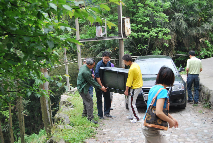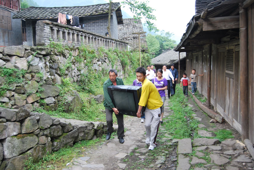 在弯弯曲曲的公路上,坐在烤箱似的汽车里,摇摇晃晃半个小时左右,终于到了我们村。由于路的原因不能直接把车开到我家,剩下的路只有靠走,电视机也只有靠人抬。