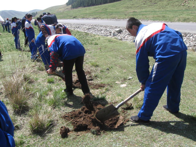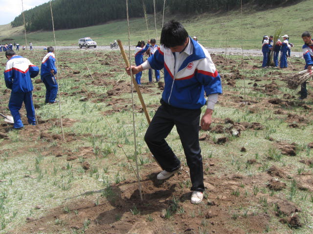 到了目的地后同学们稍稍休息了一会儿,然后等老师分配任务,不一会儿,老师带领我们到植树的地方。这时有的班级已经开始有所行动了,当然我们班的同学们也不甘落后。这时的同学拿着铁锨开始挖坑,由于种的地点是小滩河,石头比较多,等到有石头的地方就用刨镢刨。看,我们班的同学干得多卖力呀!