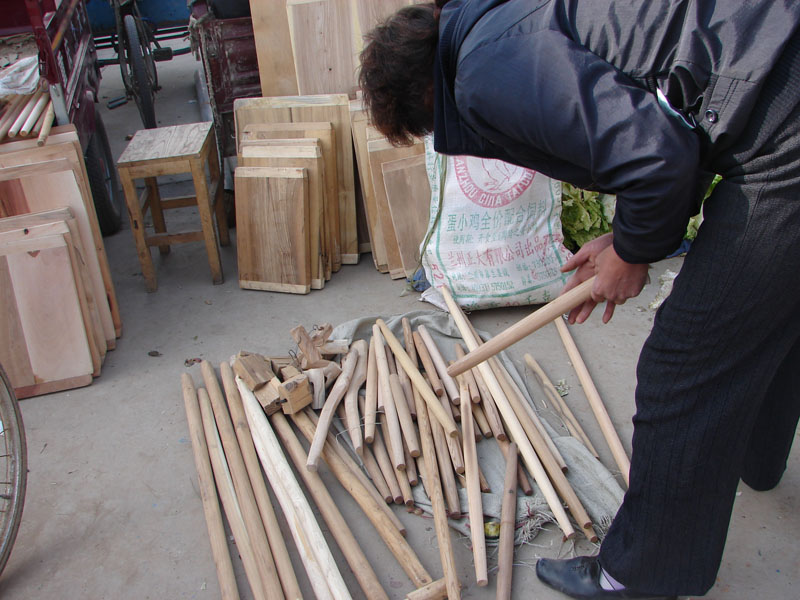 这位阿姨在挑擀面杖要买呀,在这个摊位上还有铁揪拐,瞧那个用绳子串起的小方木块是什么吗?那是自行车脚踏子,还有案板,木凳等等一些东西。