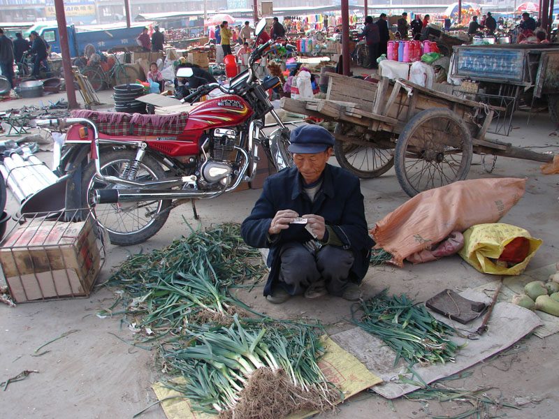 这就是我们乡的集市,也是乡里人5天才能盼到的一天。这位大叔今天真幸运,才3点钟就将自己的菜卖的差不多了,看!他在小心小心翼翼的整理自己的劳动成果呢!