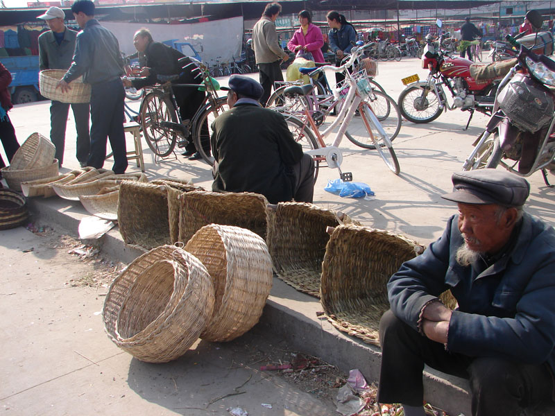 这位老大爷今天真"倒霉",集市都快完了,他编的背斗和筐一个都还没有卖出去呢,瞧他那目光,就知道他心里一片茫然…….