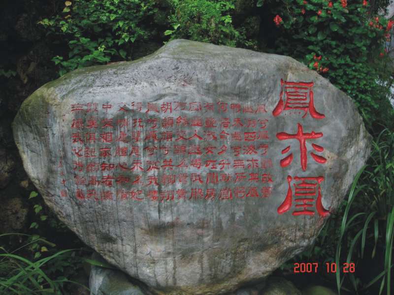 进入园林后有一大石头,上面雕刻着"凤求凰"诗词一首,"凤兮凤兮归故乡,遨游四海求其凰",这就是西汉辞赋名家司马相如写下的千古名句,石头上还雕刻介绍了"凤求凰"的来历和缘由。