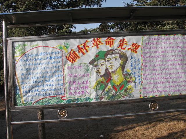 进了陵园,路两旁的宣传栏里张贴了一幅幅英雄们的先进事迹图片。看到这些我就想起了那些革命先烈,他们曾经殊死战斗,为的是今天的光明,没有革命先烈们的流血牺牲就没有我们今天的幸福生活。