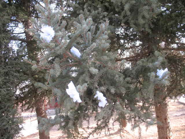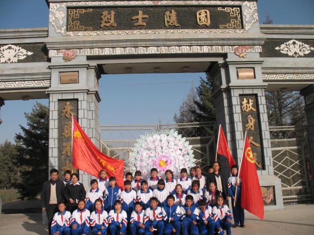一颗颗高大、笔直的松树上系满了一朵朵的小白花,老师告诉我们,这是已经来拜祭过英雄的人们留下的痕迹,表达了他们对革命烈士深深的怀念。