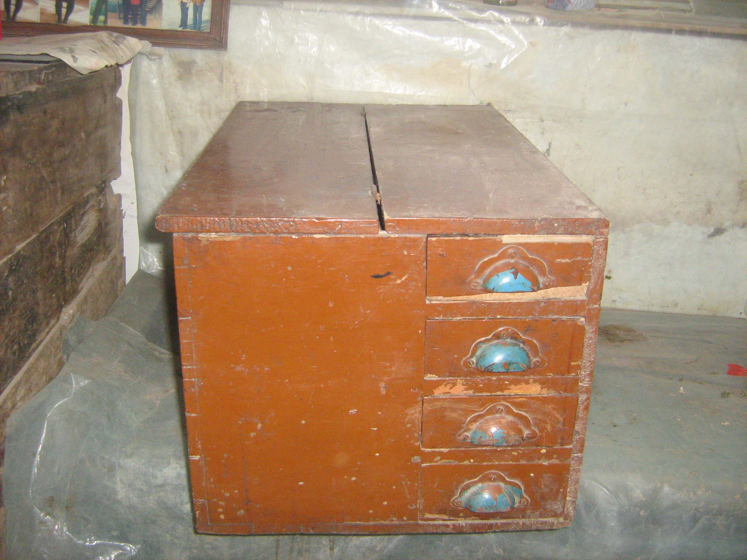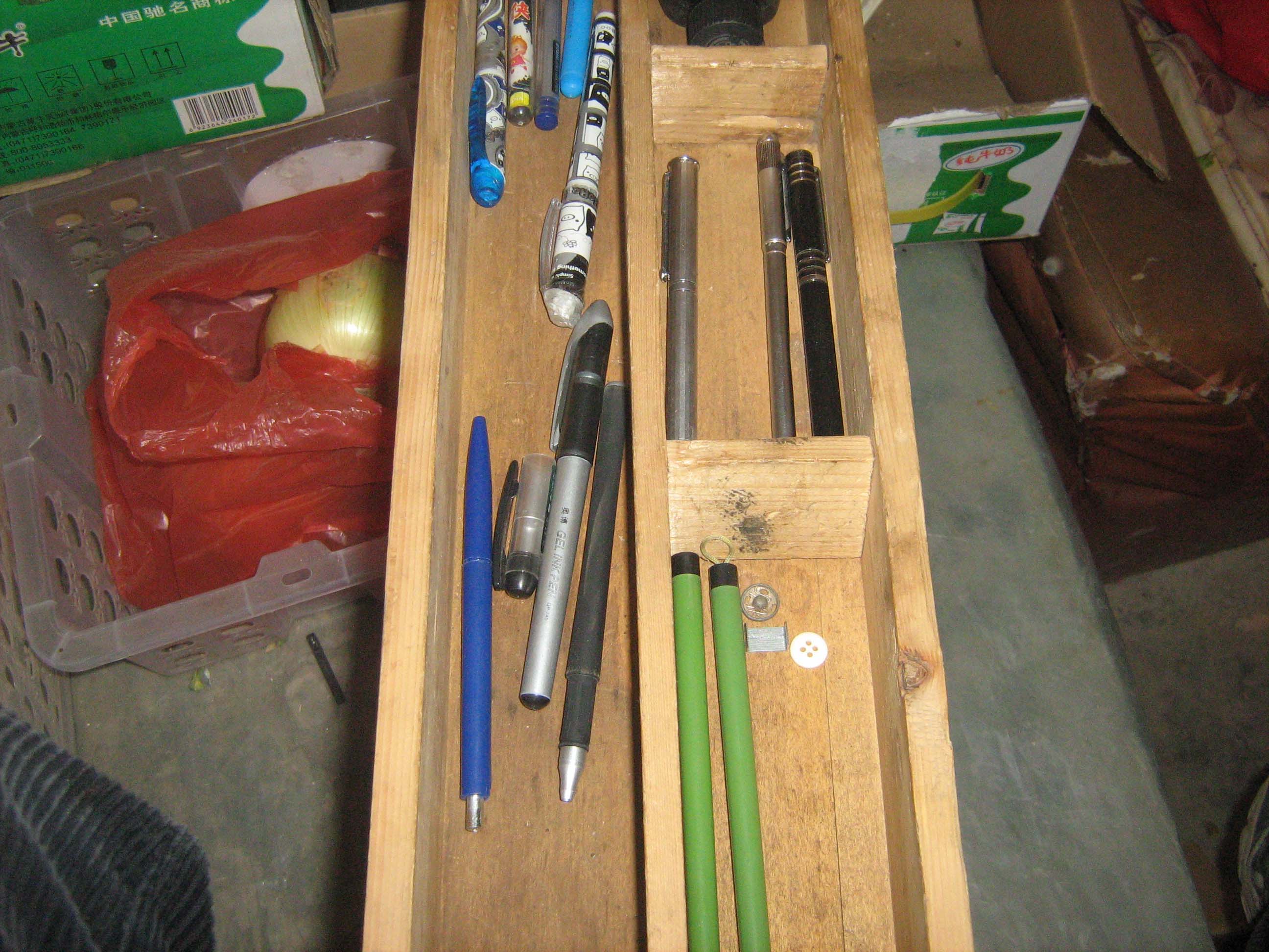 还有一个箱子,看起来是工具箱吧,掀开盖还有过去的帐本呢,这个箱子有五个小抽屉,现在我就在里面放笔,墨水.它又成了我的文具箱了.算一算,它被三代人都用过了,还完好无损,真是结实啊.