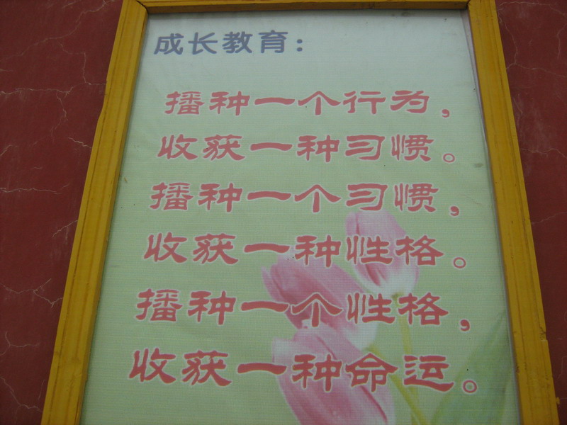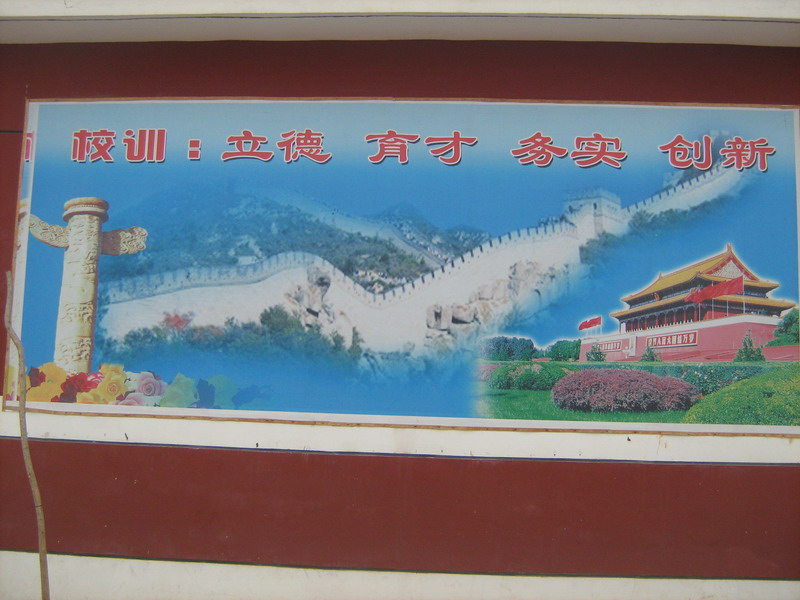 这是我们主席台边的宣传墙,它寓意深刻,上面的图案有长城,天安门,还有我们学校的校训:立德,育才,务实,创新.