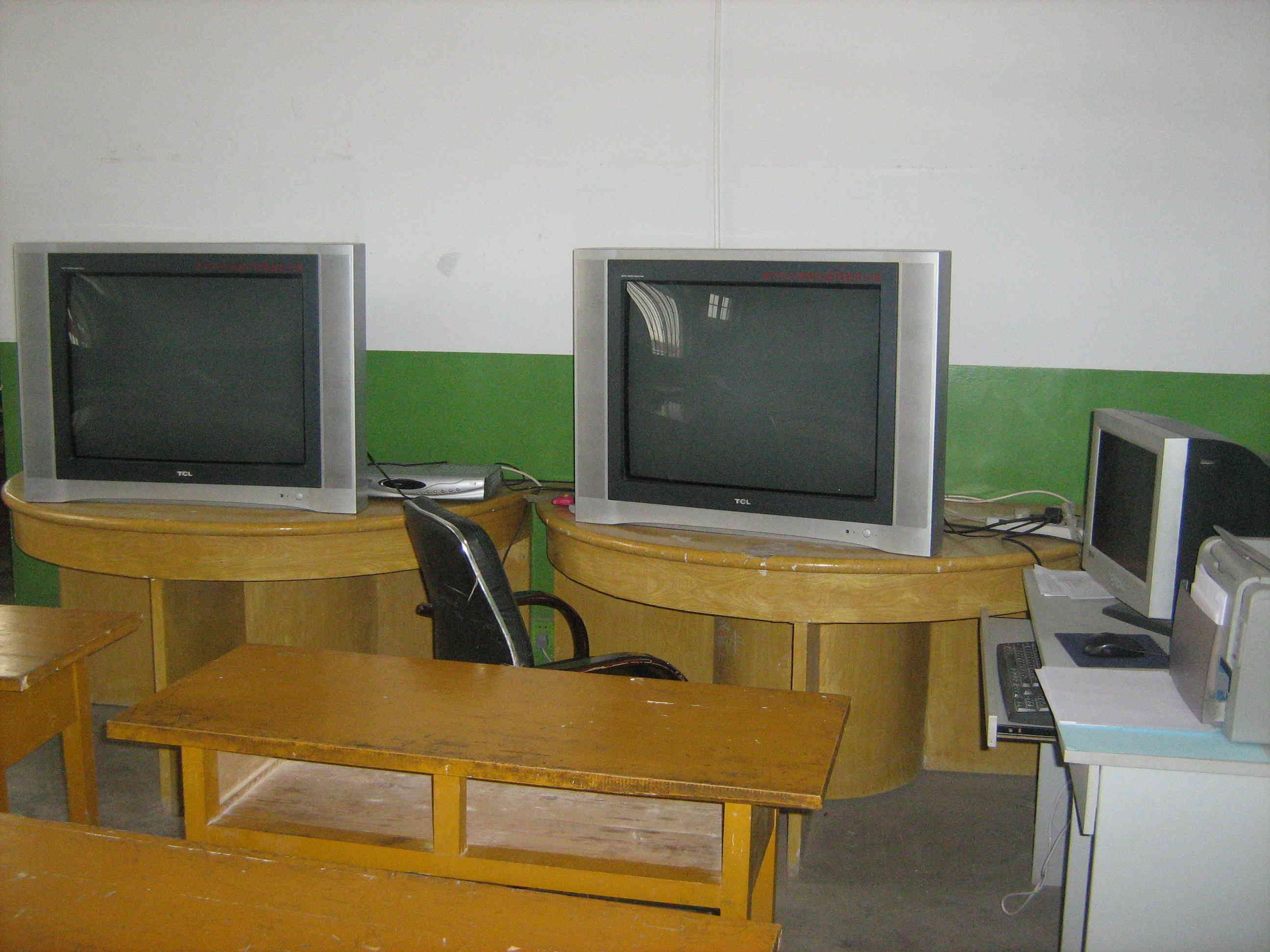 这是我们的远程教育教室,在这里我们可以看光盘,可以看老师制作的课件,平时老师没课的时候可以到这里用电脑备课,出试卷,打印论文.虽然它一次只能容纳一个班的同学上课,但是我们已经很满足了,我们最喜欢的就是这间多媒体教室.