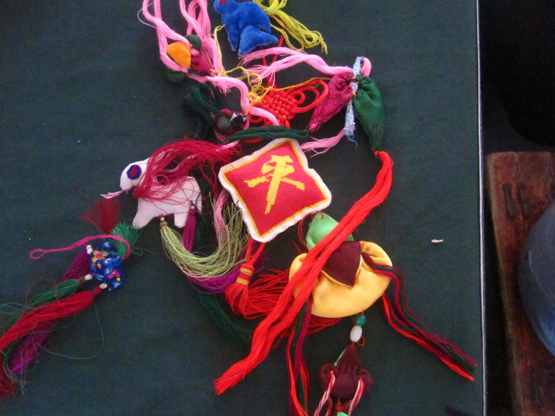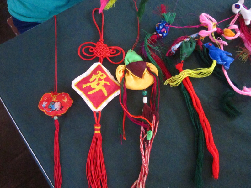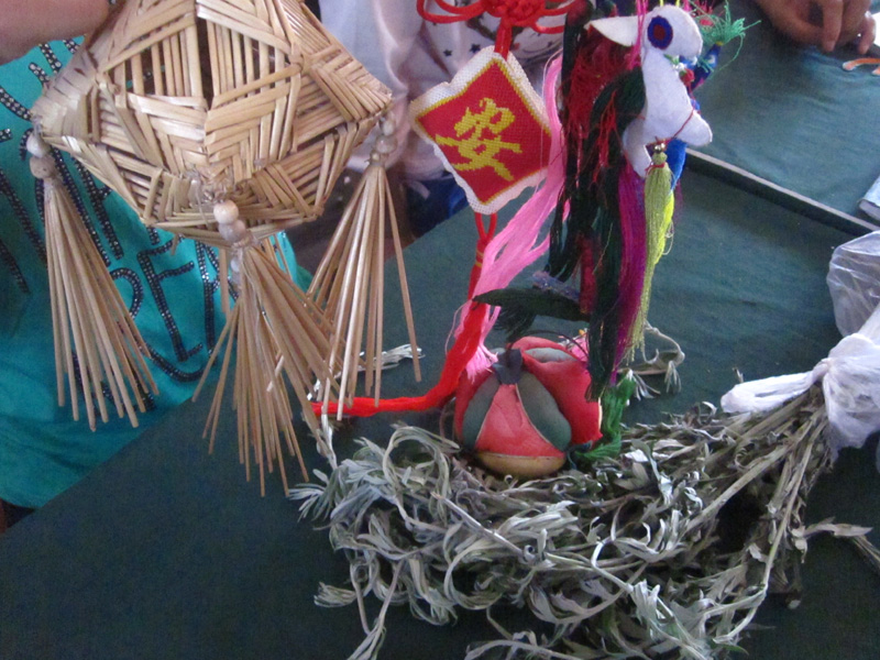历经千年,端午节的香囊早已成为特有的民间艺术品。香囊内有朱砂、雄黄、香药、香草等,其中的香药、香草则代那些正人君子。外面包上丝布,芳香宜人。再用五色的丝线扣成一个个索,作成各种各样的形状,将它们串起来,同时在上面锈上有吉祥寓意的“福”、倒“福”字和“平安”等,意味着平平安安,福至心灵。其色彩鲜明,玲珑夺目。不仅可以驱瘟辟邪,还可以起装饰,点缀作用,是我们的最爱。