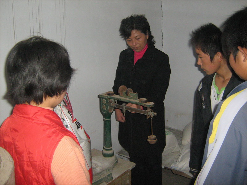 每次称粮的时候,她很耐心的为我们记数,抱袋子,不怕脏,不怕累,而且粮食的重量分豪不差.