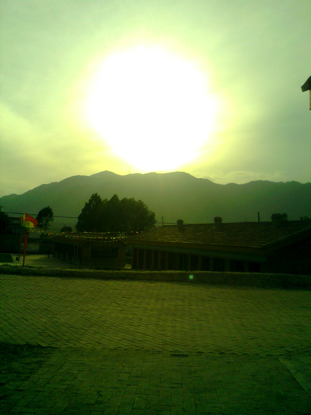 快九点了,太阳的红光慢慢消失了,只是远处的山尖尖上还有一点点红色。突然,太阳像个小孩子一样跳到山那边,一下子不见了。