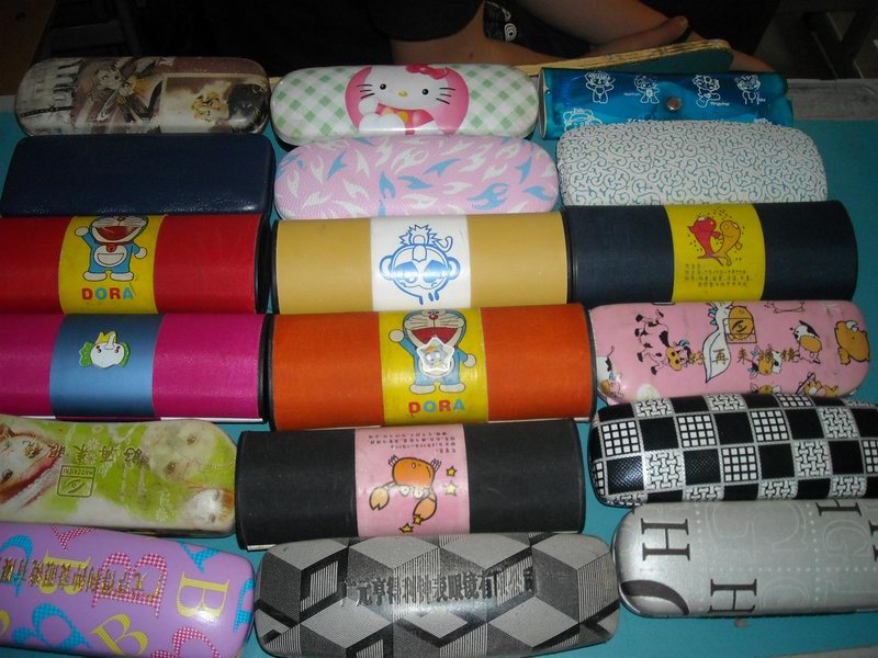这有许多的眼镜盒,形形色色的,颜色各异,有红的,有蓝的,还有黑的;女孩大多都是粉红色的,象征着甜美,男孩大多都是黑色的,象征着深沉,正如人的心情一般。形式也是各式各异,有卡通版的,有仿古版的,还有潮流化的。