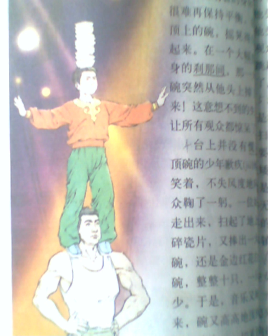 从顶碗少年的表演中我读出了他那可贵的品质:人的一生做任何事都要有耐心,有毅力,要不畏艰难,不怕挫折,学会自己承受来自四面八方的压力。从老者的言行中我也悟出给予是一种快乐,因为在别人丧失信心的时候给予鼓励无疑是雪中送炭,这会使别人摆脱沮丧重拾信心,坚定信念并走向成功。
