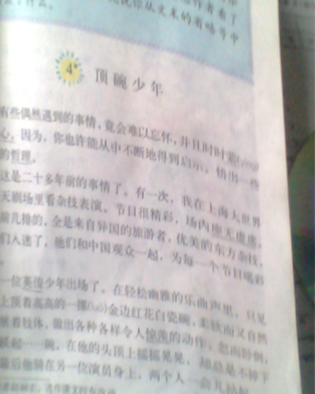 课文中的顶碗少年刚开始的时候动作优美,而到了一个难度很高也很关键的动作时,表演竟失误了,但文中的少年并没有慌张,而是沉着冷静,并且以鞠躬来表示自己内心的歉疚,而后有再次重新开始。 从中我悟出:遇到任何或是突如其来或是意料之中的事,都要沉着冷静,坦诚相对,用自己的方式去处理发生的事。 第二次表演又开始了,顶碗少年得动作又是同样的优美,观众有陶醉其中了。但是,意想不到的是又再次发生了,表演又失误了。这让再次失误的尴尬场面的顶碗少年有些不知所措。