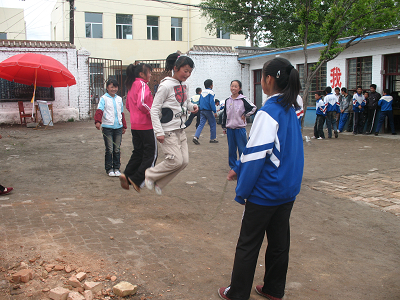 忽然一位同学说:"没有什么可侃的,不如我们跳大绳。"有同学随声附和:"好主意,可惜没有大绳……"我有……"我们以为她的身上带着,可没想到的是,她跑过去从教室门前的井口上三下五除二解下拴着的绳子。我们迫不及待的从她手里夺过来,再也不管老师骂了,我们的天真表现出来了。