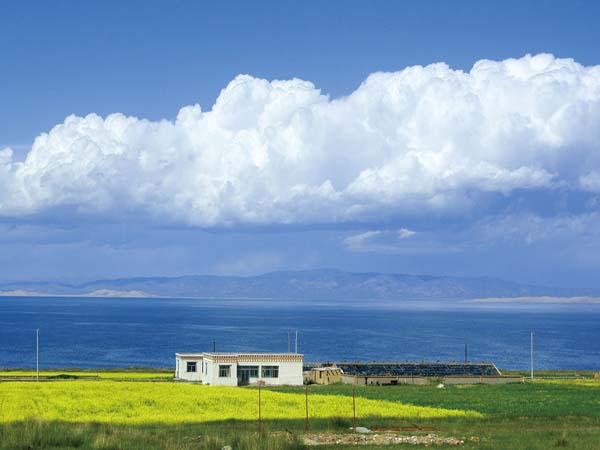 一次偶然的机会,在一个濛濛的雨天,我有幸看到了美丽的青海湖。 远远望去,青海湖与天边的乌云相连,白茫茫的一片,像轻浮在草原上的薄雾,又如直泻千里的瀑布,看上去朦朦胧胧,似烟似雾,无边无际。随着鸟儿的飞动,青海湖又呈现出了浅蓝色或青灰色。