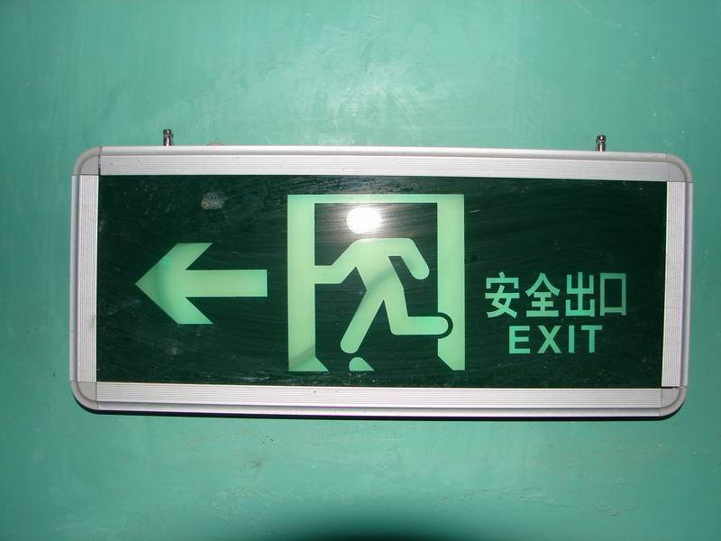 无论白天还黑夜,"安全出口灯"总是发着幽蓝的灯光,可别小看它,它上面的出口指向灯为大家紧急情况撤离危险地带提供了帮助.由于它安装的位置较低,有许多都被"坏"学生用脚踢坏了,不知这些爱做"坏"事的人脑袋瓜子是怎么想的呢?