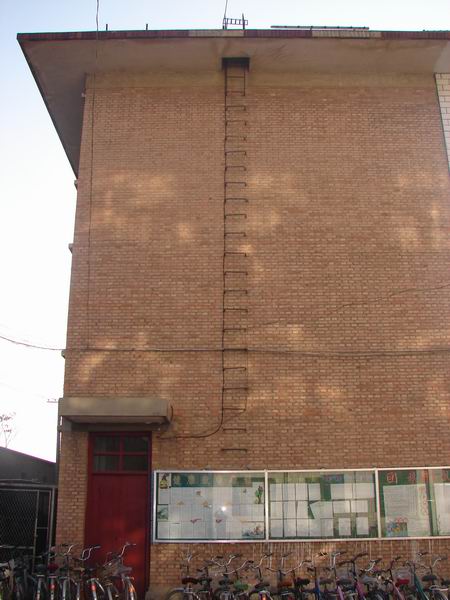 这幢楼是学校里最早的楼了。据我们计算机老师讲,他上初一时学校里兴建这幢大楼,因为当时大家没见过楼,觉得挺新奇,他便约了几个伙伴趁着看工地的校长没留心窜进了还未竣工的大楼里,校长用余光看到了影子,急忙连吼带喊的追了上去,结果这些调皮的学生却上了天台,从安装在大楼西侧的"紧急救援梯"爬下来了。校长找了半天,没见个踪影,自言自语的,真是大白天见了鬼了……呵呵,这怕是这个"救援梯"历史上发挥的唯一一次"救援"作用吧!