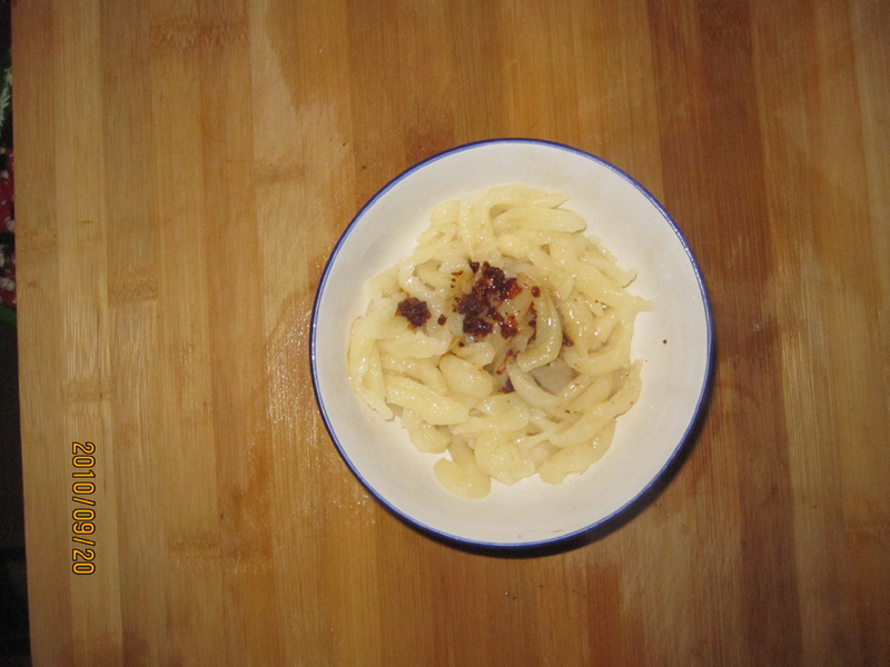 拨鱼子可配菜食用,但家乡人更喜欢在“小鱼儿”上浇上辣椒,也叫它“光棍面”,色彩鲜艳,味美不腻,诱得人食欲大增。这时,就可以动筷子了。