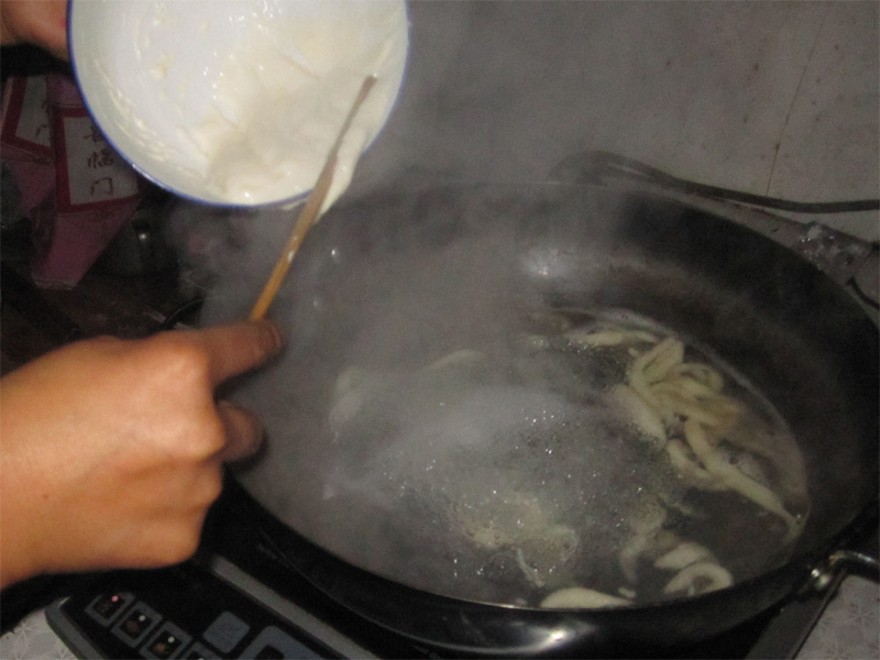 “平凡中尽有美味”,拨鱼子也不例外。因为做法简单易学,味美不腻,在我的家乡很普遍。其材料仅为一套碗筷,面粉和水。其中,面粉和水的比例约为3:1。接着就是制作。首先把面粉倒入碗中,再倒入适量的水,用筷子加以搅拌,使面团变得十分精道。再放置5分钟左右,待锅里水开后,用筷子将面团从里往外,向碗沿一旋,一条“鱼儿”跳进了水中,就这样拨到差不多。待到鱼儿浮到水面上时,就可以捞出锅了。