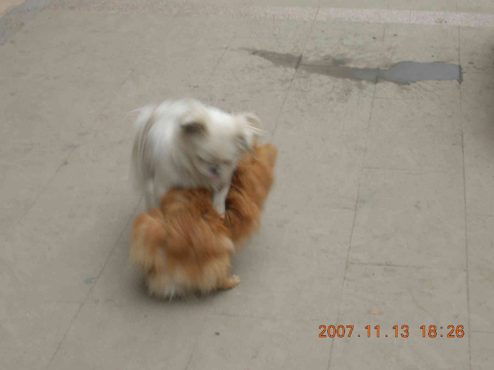 这里还有两只狗在打跳呢!一会儿你追我,一会儿我追你。追到了便用爪子挠,用舌头添,无论什么事都走在一起。惟有一种情况,那就是当另一只狗来的话,那可就糟了,三只狗在一起,就会打起来,一个顾一个,那到真是狗血淋头。不过,有时看着还瞒可爱的。