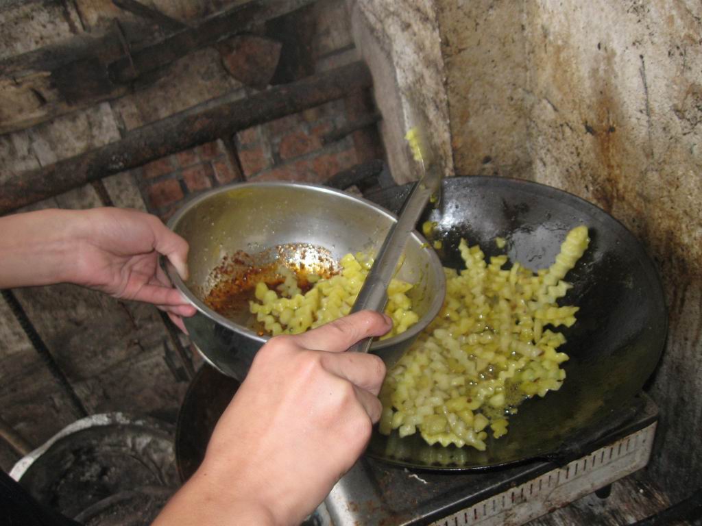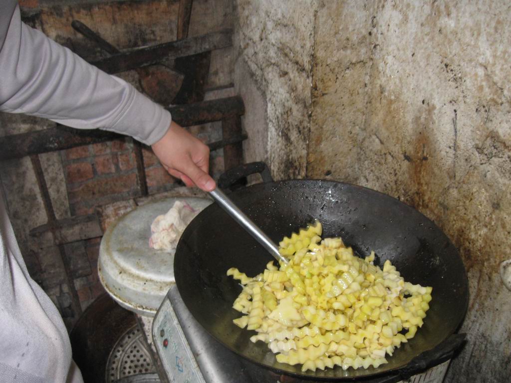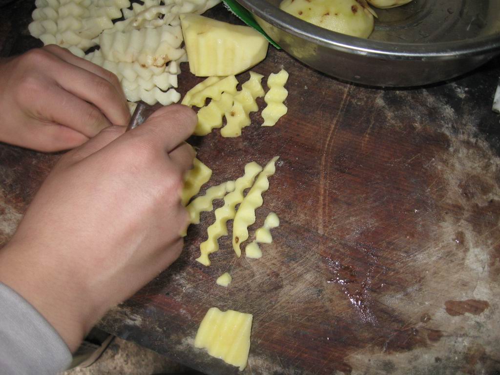 首先,先将洋芋从口袋里取出,我和罗国文两个人大约七个就够了。来到水管边,先用水将洋芋稍微地洗一下,然后用刀削皮。这削皮可不好削,有的洋芋生得怪,不好削,花了我很长时间才削完。接着,便将削好的洋芋拿到菜板上切,要用波浪形的刀切,没一会就切完。为了更干净,我们又去水管上冲一下,然后小心翼翼地将水倒掉,很有可能要倒掉洋芋,所以要小心。