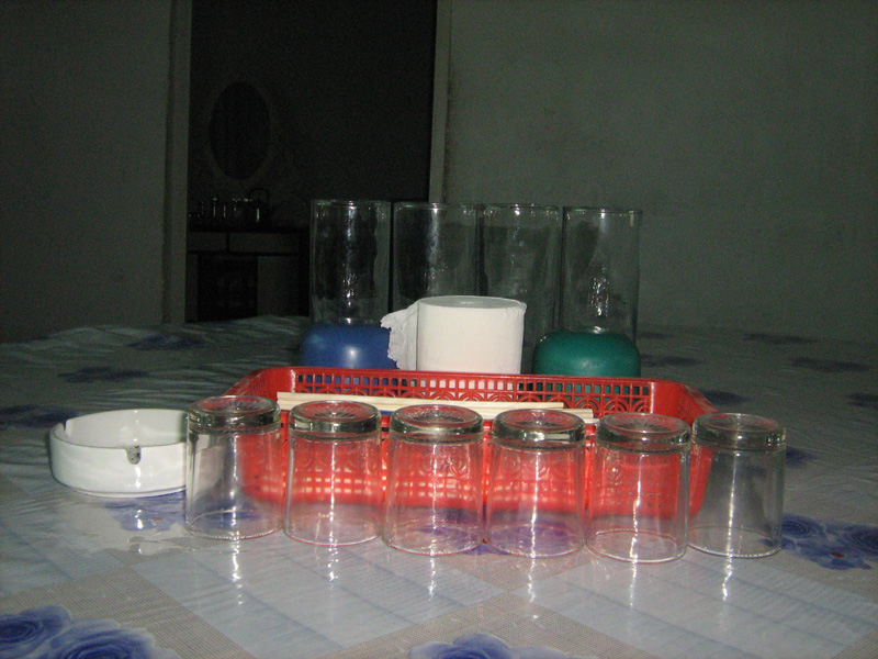 我家小饭馆屋内摆设极其简单,屋内只摆设了一些桌子和板凳,桌子上摆了卫生筷和餐巾纸,还放了喝酒用的筛盅,周围放了许多杯子,虽然这些摆设比较简单,但它仍能营造舒适的环境。