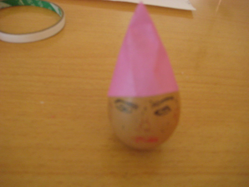 最后再找来白纸,把它折成帽子的形状,用胶水固定在鸡蛋那个洞的位置,用画笔在帽子上画了两只圆溜溜的大眼睛,又画了一个大鼻子,还画上了一张小巧玲珑的嘴巴,一个"不倒翁"在我的手中诞生了,我仔细地端详着这个"不倒翁",用手按了几下它的脑门,它左右摆动,那调皮的样子好像在对我说:"我不会倒的,我不会倒的……"看着看着,我心里充满着成功的喜悦。