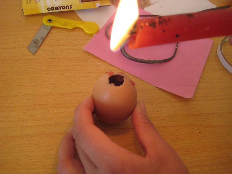 先用小刀在鸡蛋的顶部小心翼翼地挖了一个洞,然后把蛋清和蛋黄一点点地倒出来,再把沙慢慢地放入蛋壳里,接着点燃蜡烛,把蜡滴在沙子的上面,目的是固定沙子,使它下重上轻,不会倒。