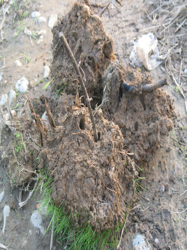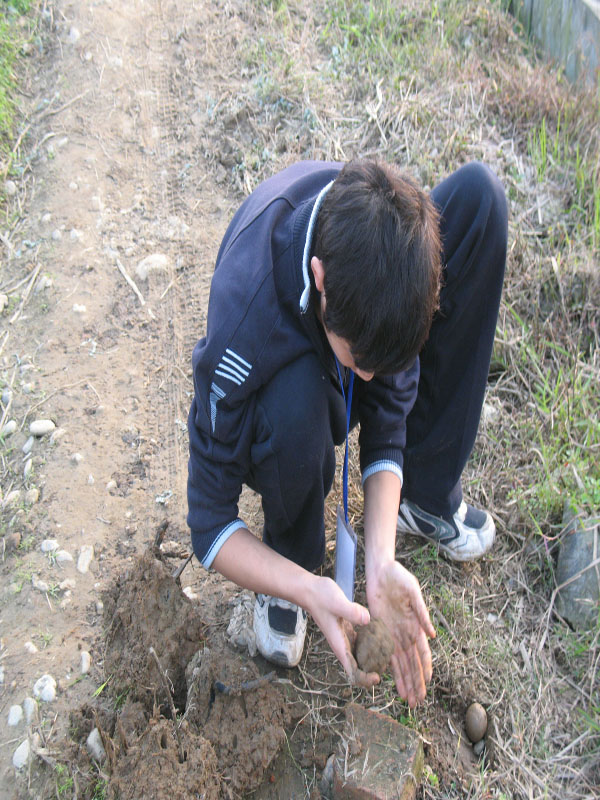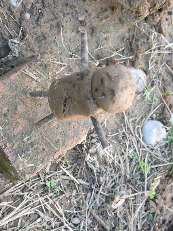 做泥人首先要准备一些不干不稀的泥,我来到田边挖了些泥。然后我把泥捏了一会,待捏匀后把它放在地上,再找一根细细的木棍。这样制作泥人的材料已经备齐了。
