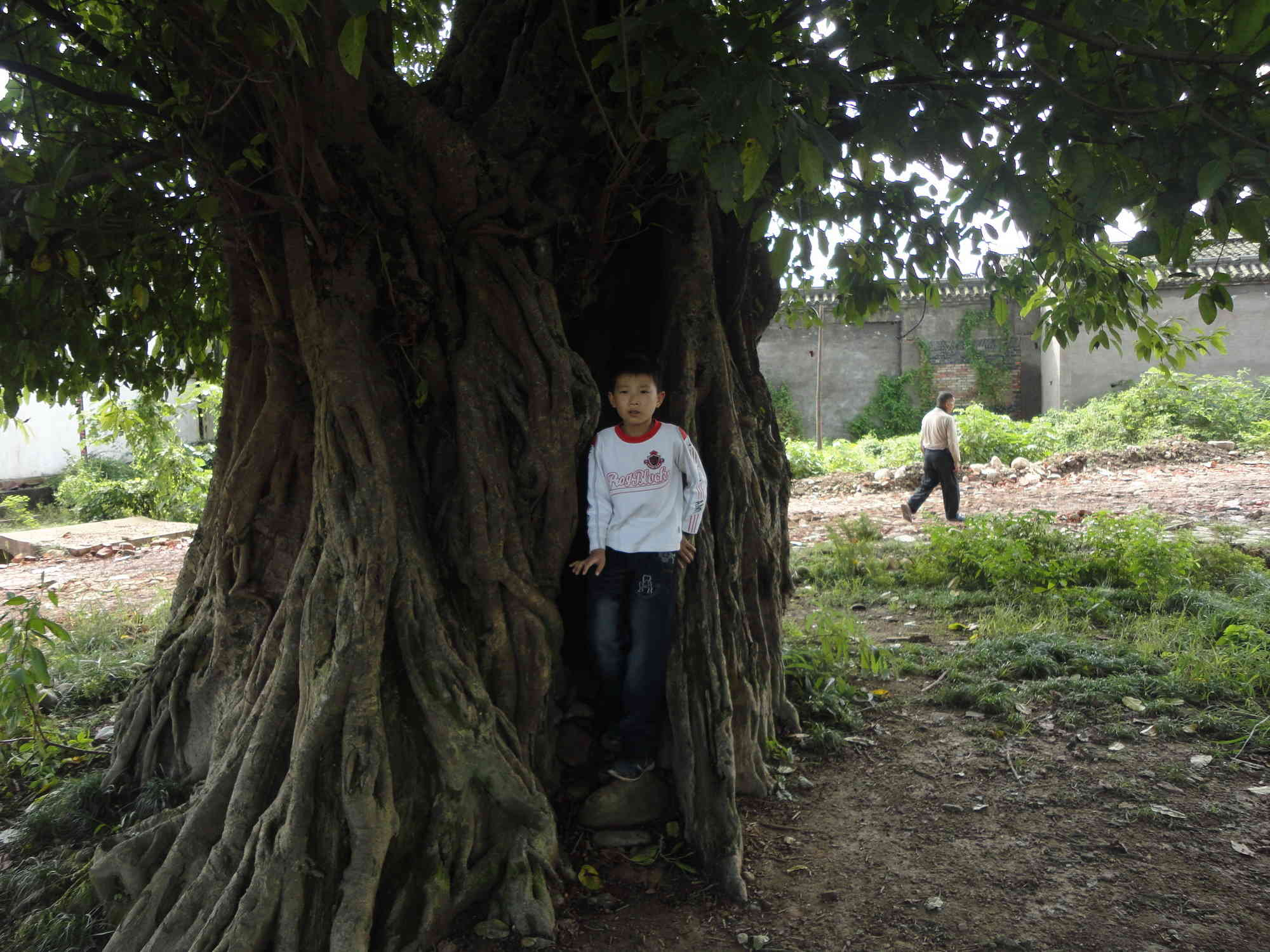 母子树的旁边是恐龙树,称它恐龙树,并不是因为它长相丑陋,而是它主躯干都趴在地上,只是在躯干的末端才略微向上抬头,因而小孩子们都能轻松地爬上枝头。这样的体形和神态,就象最大的动物恐龙昂首向天吼叫,给人无比震撼。在这些巨榕树中,恐龙树是树干最大和离地最近的树,但跟别的榕树一样,枝叶茂盛,生机勃勃,甘甜的临溪河养育着家乡的人们也养育着这些可爱的大树。