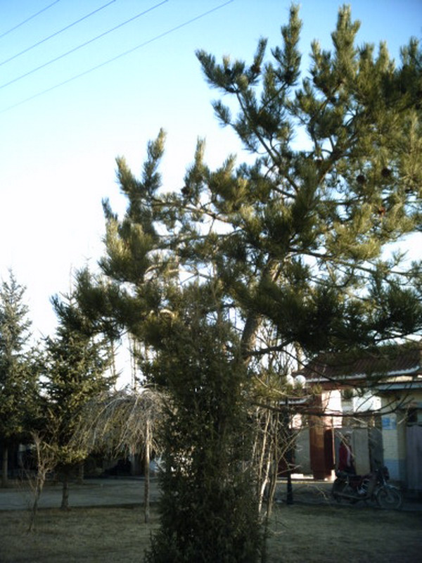 春天到了,校园的松树上的叶子是绿色的。别的植物才开始发芽生长,而松树长着青绿的叶子,看起来特别美丽。