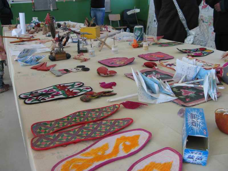 大家看到的是我校的书画平台展示,平台上有学生绣的鞋垫、手工艺品等。