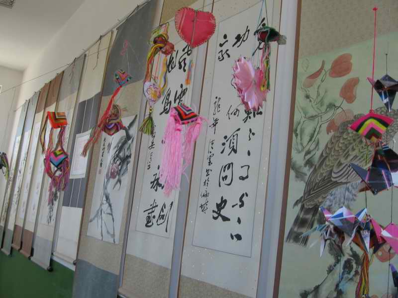 为了丰富我校的校园文化生活。学校倡导各班学生、各科任教师拿出自己的书画作品,不到两周时间,在全体师生的心情努力下,我们终于拿出了自己最得心应手的作品。这样,学校将这些作品收集整理,组建成了我们学校的书画展室。