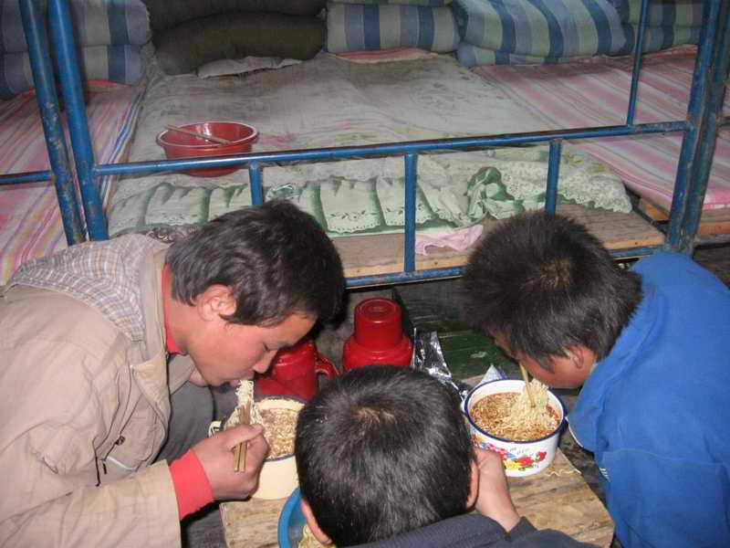 最有意思的就是那吃方便面,只见三四个人围成一团,狼吞虎咽的吃起来,一会儿碗里的面就只剩些残渣了,我们便将馍馍泡在碗里,直到吃饱喝足了才为止。